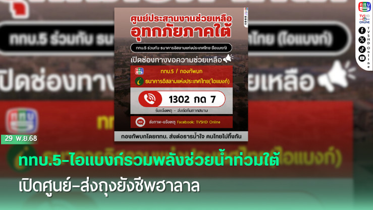 วันที่ 29 พ.ย.68 - สถานีวิทยุโทรทัศน์กองทัพบก (ททบ.5) ธนาคารอิสลามแห่งประเทศไทย (ไอแบงก์) และสภาเครือข่ายช่วยเหลือด้านมนุษยธรรม สํานักจุฬาราชมนตรี ร่วมบูรณาการกําลังทุกภาคส่วน เพื่อช่วยเหลือผู้ประสบอุทกภัยภาคใต้ที่ได้รับผลกระทบอย่างหนัก โดยเฉพาะพื้นที่จังหวัดสงขลา สตูล ยะลา ปัตตานี และนราธิวาส ผ่านการจัดตั้ง “ศูนย์น้ําใจ ibank ช่วยเหลือผู้ประสบอุทกภัย” และภารกิจลงพื้นที่ช่วยเหลือแบบเร่งด่วน