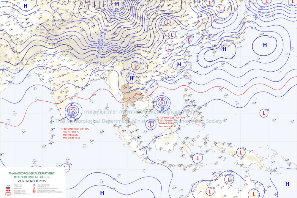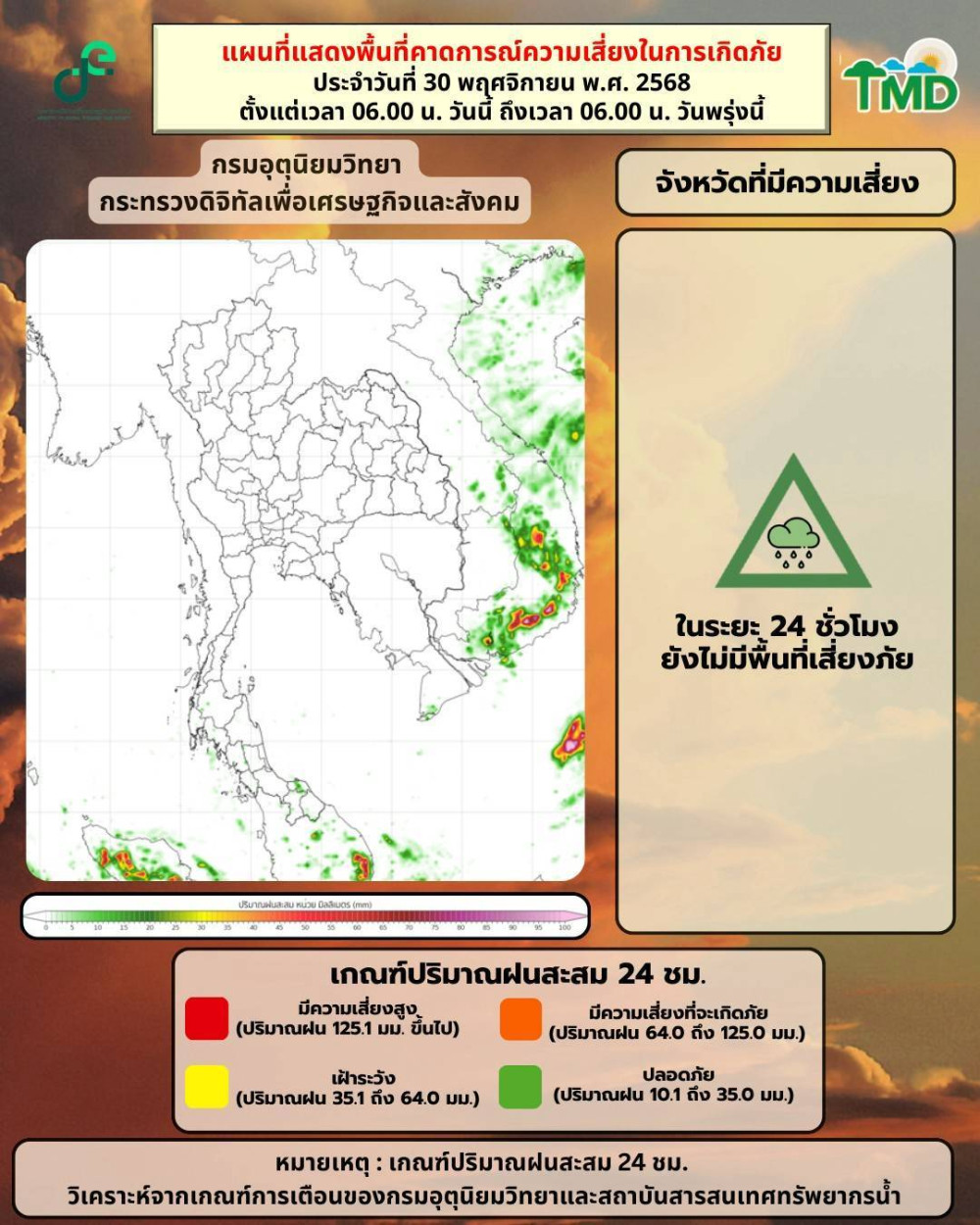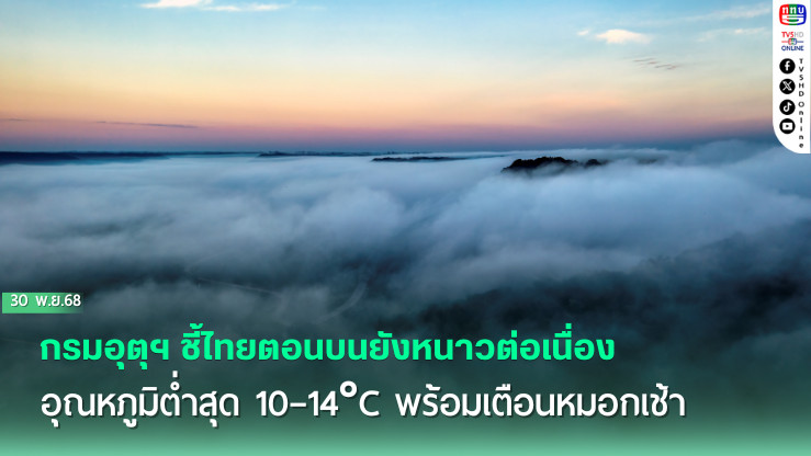 30 พฤศจิกายน 2568 กรมอุตุนิยมวิทยาออกพยากรณ์อากาศประจําวัน ระบุว่า ตลอด 24 ชั่วโมงข้างหน้า ประเทศไทยตอนบนยังคงเผชิญอากาศเย็นถึงหนาว อุณหภูมิจะเริ่มสูงขึ้นเล็กน้อย 1–4 องศาเซลเซียส แต่ในช่วงเช้ายังคงมี หมอกบางปกคลุมหลายพื้นที่ โดยเฉพาะภาคเหนือและภาคอีสานที่ยังคงมีอุณหภูมิต่ําสุดเพียง 10–14 องศาเซลเซียส ส่วนยอดดอยบางพื้นที่ยังหนาวจัดอุณหภูมิต่ําถึง 5 องศาเซลเซียส