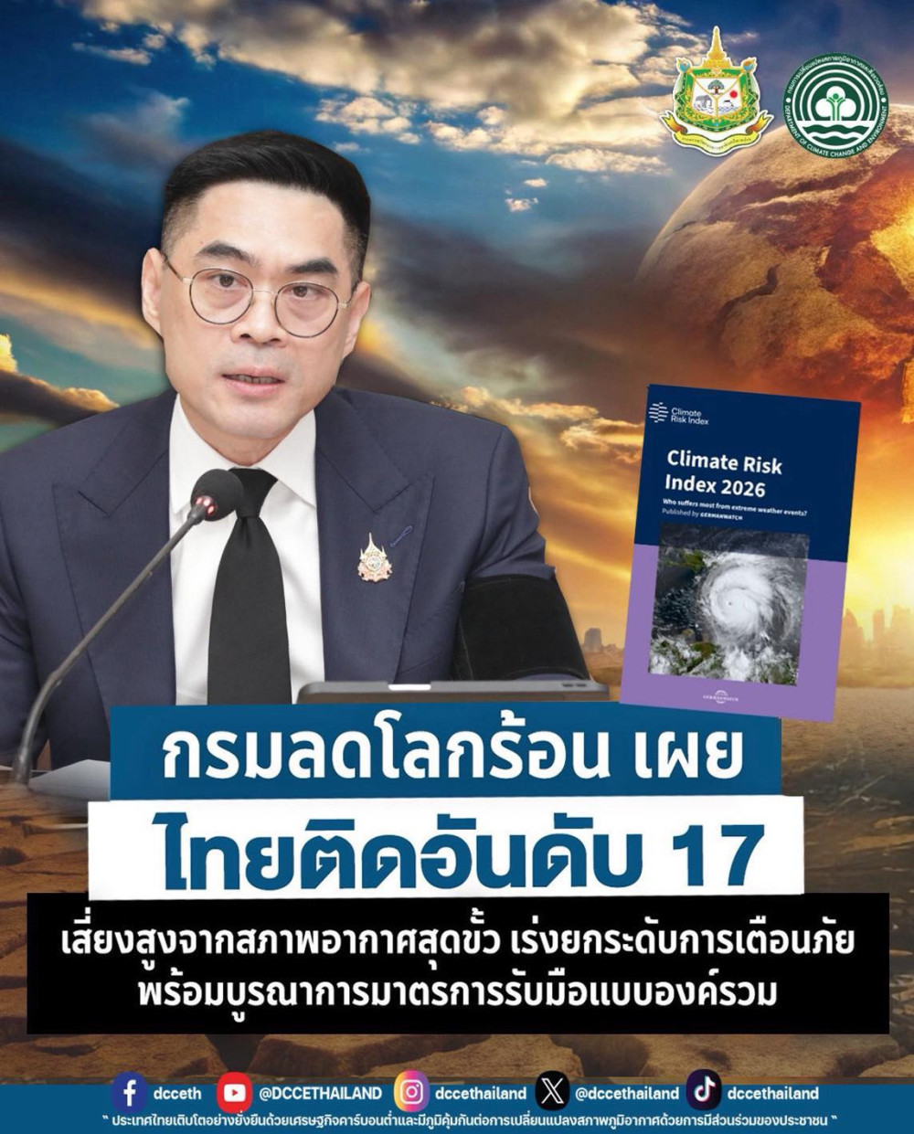 ดร.พิรุณ สัยยะสิทธิ์พานิช อธิบดีกรมการเปลี่ยนแปลงสภาพภูมิอากาศและสิ่งแวดล้อม เผย ข้อมูลจากรายงาน Climate Risk Index (CRI) 2026 โดยองค์กร Germanwatch ที่ประเมินผลกระทบจากเหตุการณ์สภาพอากาศสุดขั้วทั่วโลก โดยใช้ฐานข้อมูลระหว่างประเทศ ช่วงระยะเวลา 30 ปี (ค.ศ. 1995–2024) พบว่า ในปี 2024 ประเทศไทยมีความเสี่ยงเพิ่มขึ้น อยู่ในอันดับที่ 17 จากอันดับที่ 72 ในปี 2022 สะท้อนถึงความเปราะบางต่อเหตุการณ์สภาพอากาศสุดขั้วอย่างชัดเจน ส่วนความเสี่ยงระยะยาว 30 ปี อยู่อันดับที่ 22 จากอันดับที่ 30 ในปี 2022 แสดงให้เห็นว่าความเสี่ยงของไทยเพิ่มสูงขึ้น