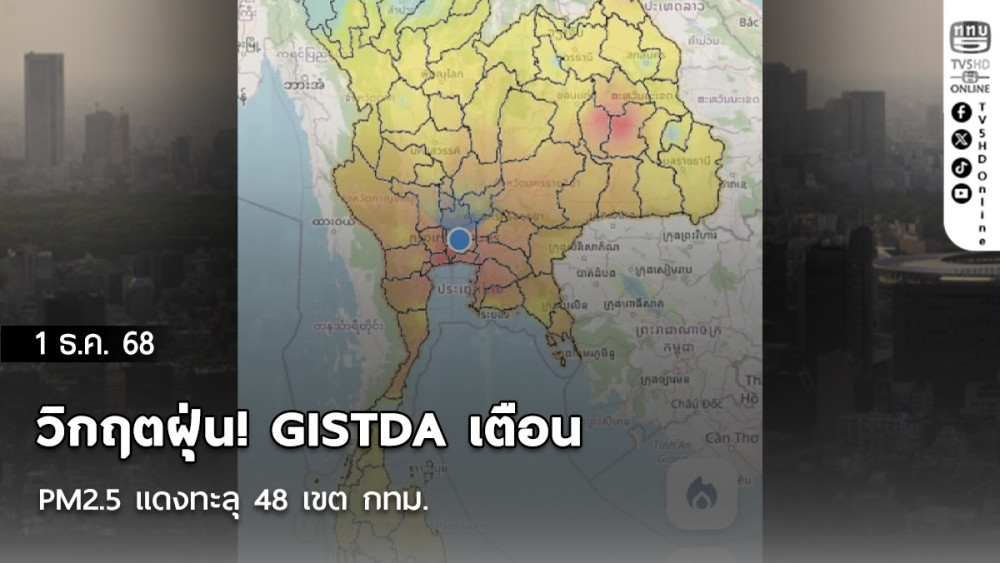 วันที่ 1 ธ.ค.68 - สถานการณ์ฝุ่นละอองขนาดเล็ก PM2.5 ในพื้นที่กรุงเทพมหานครและจังหวัดใกล้เคียงเข้าสู่ภาวะวิกฤตอย่างรุนแรงอีกครั้ง สํานักงานพัฒนาเทคโนโลยีอวกาศและภูมิสารสนเทศ (GISTDA) ได้อัปเดตค่าฝุ่น PM2.5 เมื่อเวลา 06.00 น. ผ่านแอปพลิเคชัน "เช็คฝุ่น" โดยพบว่า ทั่วประเทศมีคุณภาพอากาศอยู่ในระดับเกินมาตรฐานสีแดง (มีผลกระทบต่อสุขภาพ) แล้ว 5 จังหวัด และระดับสีส้ม (เริ่มมีผลกระทบ) ถึง 41 จังหวัด