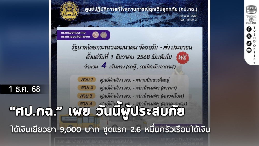“ศป.กฉ.” เผย วันนี้ผู้ประสบภัยได้เงินเยียวยา 9,000 บาท ชุดแรก แล้วจะเร่งดําเนินการให้ครบให้เร็วที่สุด คาดรพ.หาดใหญ่เปิดให้บริการเต็มที่ใน5-8 สัปดาห์ กรณีรถหาย-รถเสียติดต่อได้ทางตํารวจหรือกรมการขนส่งทางบก