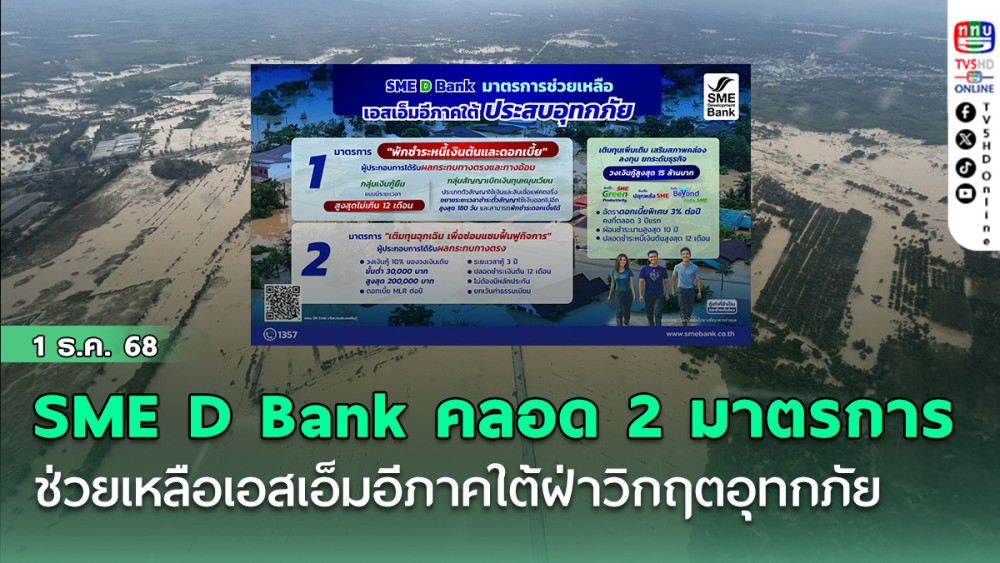 ธนาคารพัฒนาวิสาหกิจขนาดกลางและขนาดย่อมแห่งประเทศไทย (ธพว.) หรือ SME D Bank ได้ประกาศมาตรการทางการเงินเพื่อช่วยเหลือผู้ประกอบการเอสเอ็มอีในพื้นที่ภาคใต้ที่ได้รับผลกระทบจากสถานการณ์อุทกภัย โดยมีวัตถุประสงค์เพื่อบรรเทาภาระทางการเงินและสนับสนุนสภาพคล่องให้สามารถกลับมาดําเนินธุรกิจได้อีกครั้ง