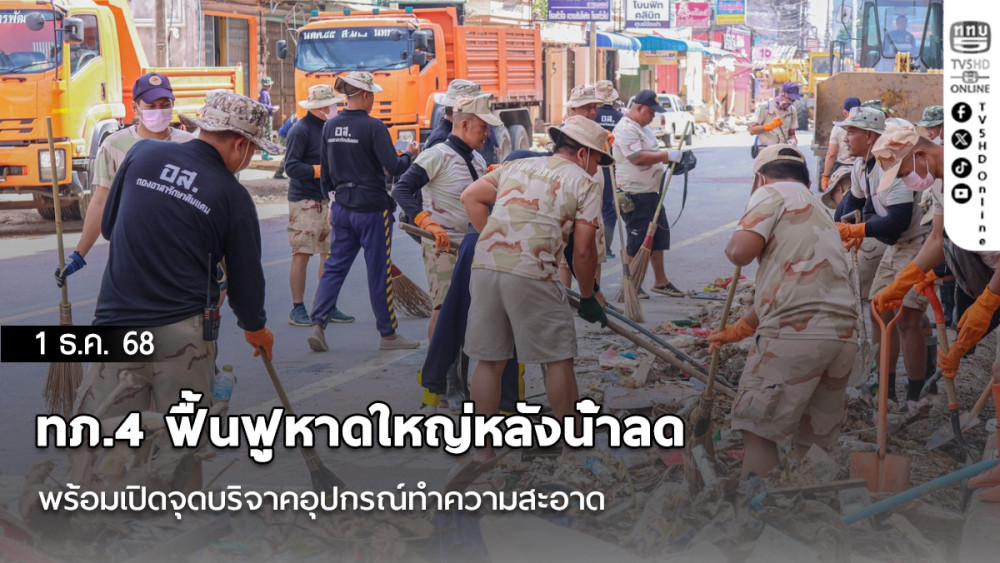 กองทัพภาคที่ 4 เปิดศูนย์รับบริจาค ระดมอุปกรณ์ทําความสะอาด เร่งฟื้นฟู "หาดใหญ่" หลังน้ําลด ต้องการไม้กวาด-เครื่องฉีดน้ําแรงดันสูง ช่วยหน่วยทหารปฏิบัติการทําความสะอาด 4 โซนหลัก เพื่อให้ประชาชนกลับสู่ภาวะปกติ