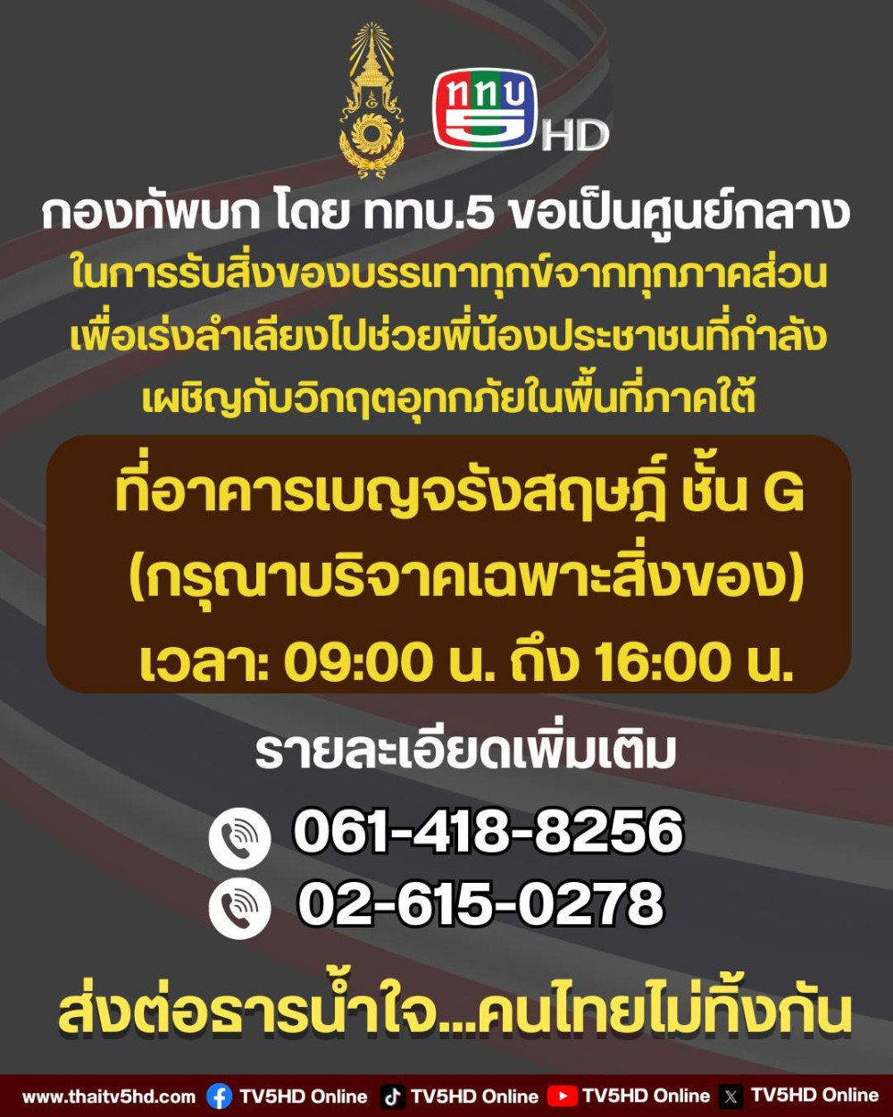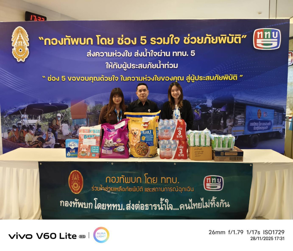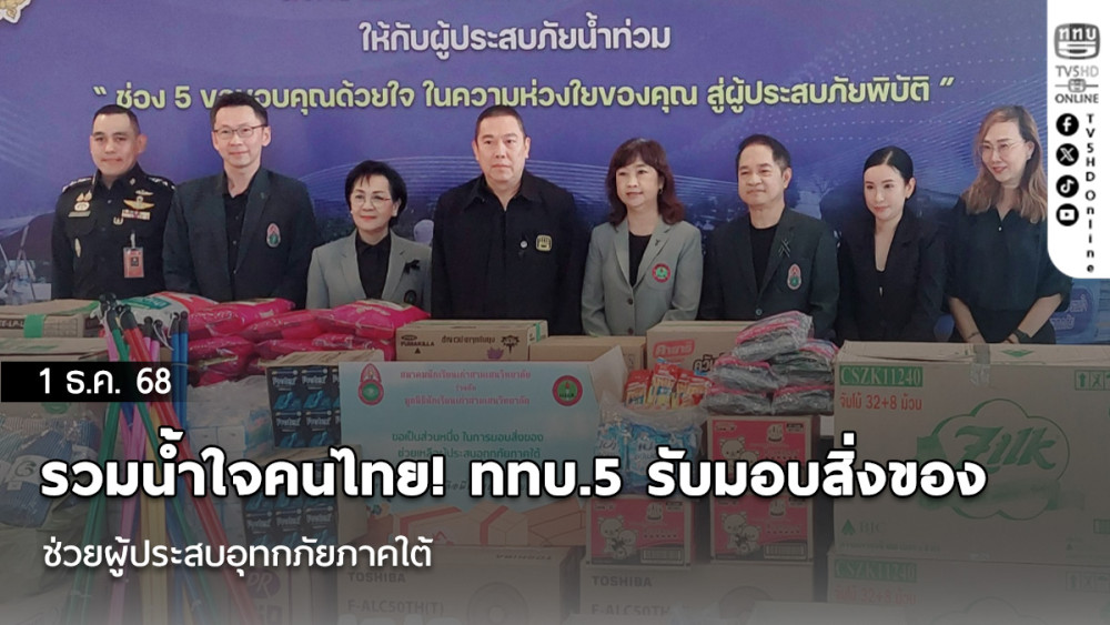 เมื่อวันที่ 1 ธ.ค.68 สถานีวิทยุโทรทัศน์กองทัพบก (ททบ.5) รับมอบสิ่งของเครื่องใช้จําเป็นจาก สมาคมนักเรียนเก่าสามเสนวิทยาลัย ร่วมกับ มูลนิธินักเรียนเก่าสามเสนวิทยาลัย ภายใต้โครงการ “ธารน้ําใจ ช่วยเหลือพี่น้องผู้ประสบภัยภาคใต้” เพื่อร่วมบรรเทาความเดือดร้อนและยืนหยัดเคียงข้างประชาชนในช่วงเวลาที่ยากลําบากนี้