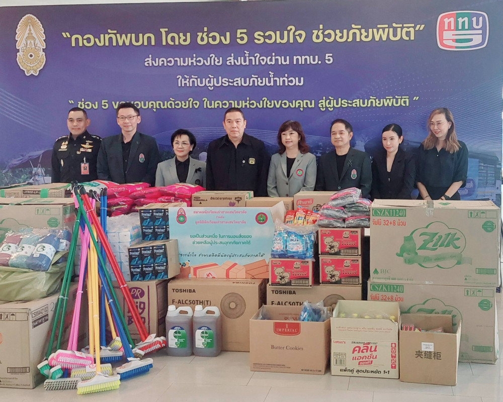 โดยมี พลโท ชัยสิทธิ์ ภาวศุทธิกุล ที่ปรึกษากรรมการผู้อํานวยการใหญ่ ททบ.5 เป็นผู้แทนรับมอบสิ่งของช่วยเหลือ ซึ่งประกอบด้วย ข้าวสาร น้ํามันพืช กระดาษทิชชู่ ถุงขยะสีดํา ผ้าขนหนู