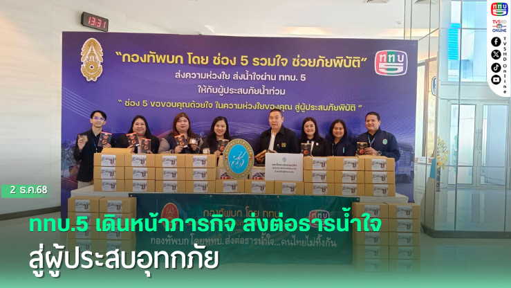 สถานีวิทยุโทรทัศน์กองทัพบก (ททบ.5) ยังคงเดินหน้าส่งต่อความช่วยเหลือสู่พี่น้องชาวใต้ ผ่านพลังแห่งการแบ่งปันจากภาคเอกชนและประชาชน ที่ไม่เคยปล่อยให้ผู้เดือดร้อนต้องยืนอยู่ลําพังในยามวิกฤติอุทกภัยครั้งนี้