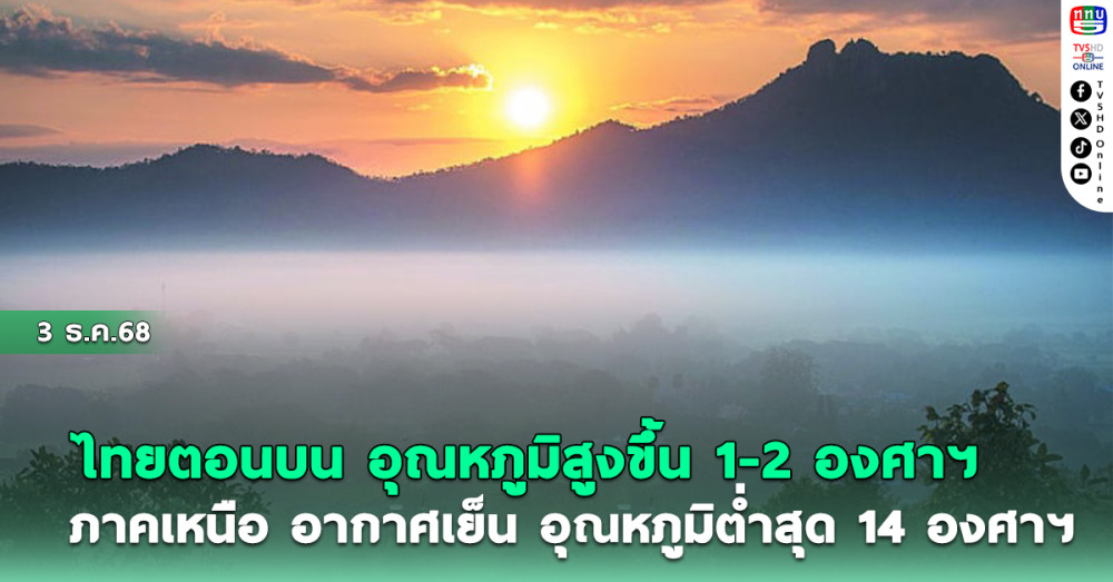 03 ธันวาคม 2568 กรมอุตุนิยมวิทยา พยากรณ์อากาศ 24 ชั่วโมงข้างหน้า ประเทศไทยตอนบนมีอุณหภูมิสูงขึ้น 1-2 องศาเซลเซียส กับมีหมอกในตอนเช้า แต่ยังคงมีอากาศเย็นถึงหนาวในภาคเหนือตอนบน ส่วนภาคตะวันออกเฉียงเหนือ ภาคกลาง ภาคตะวันออก และภาคใต้ตอนบนมีอากาศเย็นในตอนเช้า ขอให้ประชาชนในบริเวณดังกล่าวดูแลรักษาสุขภาพจากสภาพอากาศที่เปลี่ยนแปลง และเพิ่มความระมัดระวังในการสัญจรผ่านบริเวณที่มีหมอก รวมถึงให้ระวังอันตรายจากอัคคีภัยที่อาจเกิดขึ้นจากสภาพอากาศแห้งไว้ด้วย เนื่องจากบริเวณความกดอากาศสูงหรือมวลอากาศเย็นที่ปกคลุมประเทศไทยตอนบน และทะเลจีนใต้มีกําลังอ่อนลง