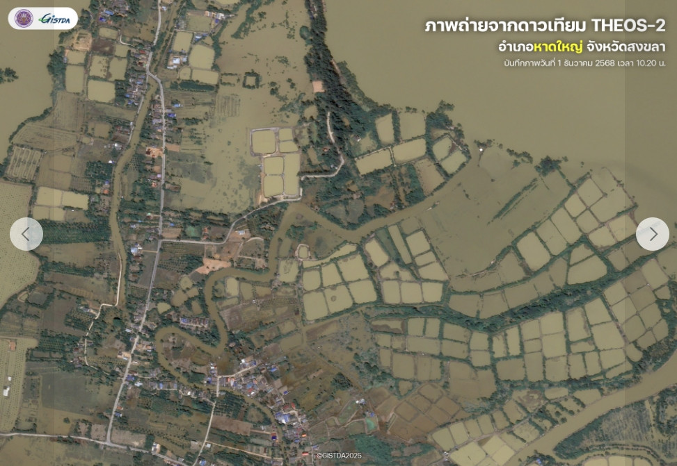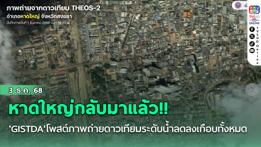 เมื่อวันที่ 2 ธ.ค.2568 เพจเฟซบุ๊ก "GISTDA สํานักงานพัฒนาเทคโนโลยีอวกาศและภูมิสารสนเทศ (องค์การมหาชน)" ได้โพสต์ภาพถ่ายดาวเทียมเมืองหาดใหญ่ล่าสุดเมื่อเวลา 10.20 น. วันที่ 1 ธ.ค. โดยระบุว่า "GISTDA เผยภาพถ่ายจากดาวเทียม THEOS-2 บันทึกเมื่อวันที่ 1 ธันวาคม 2568 เวลา 10.20 น. แสดงให้เห็นสภาพใจกลางเมืองหาดใหญ่หลังน้ําลดอย่างชัดเจน จากภาพถ่ายพบว่า ระดับน้ําได้ลดลงเกือบทั้งหมด ทั้งในเขตชุมชนและพื้นที่สําคัญ โดยเฉพาะถนนสายหลักและย่านที่พักอาศัย