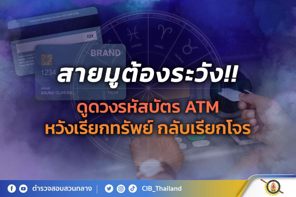 สอบสวนกลาง (CIB) จึงขอเตือนสายมูเตลูทุกท่านว่า การโพสต์ข้อมูลส่วนบุคคลลงในโลกออนไลน์ อย่างเช่น รหัส เลขหน้าบัตรหรือหลังบัตร เดือนปีหมดอายุของบัตร ATM หรือบัตรเครดิต อาจทําให้เราตกเป็นเหยื่อของมิจฉาชีพได้ เพราะมิจฉาชีพอาจนําข้อมูลเหล่านี้ไปรวมกับข้อมูลส่วนตัวของเรา จนสามารถเข้าถึงเงินในบัญชีธนาคารของเราได้ในที่สุด