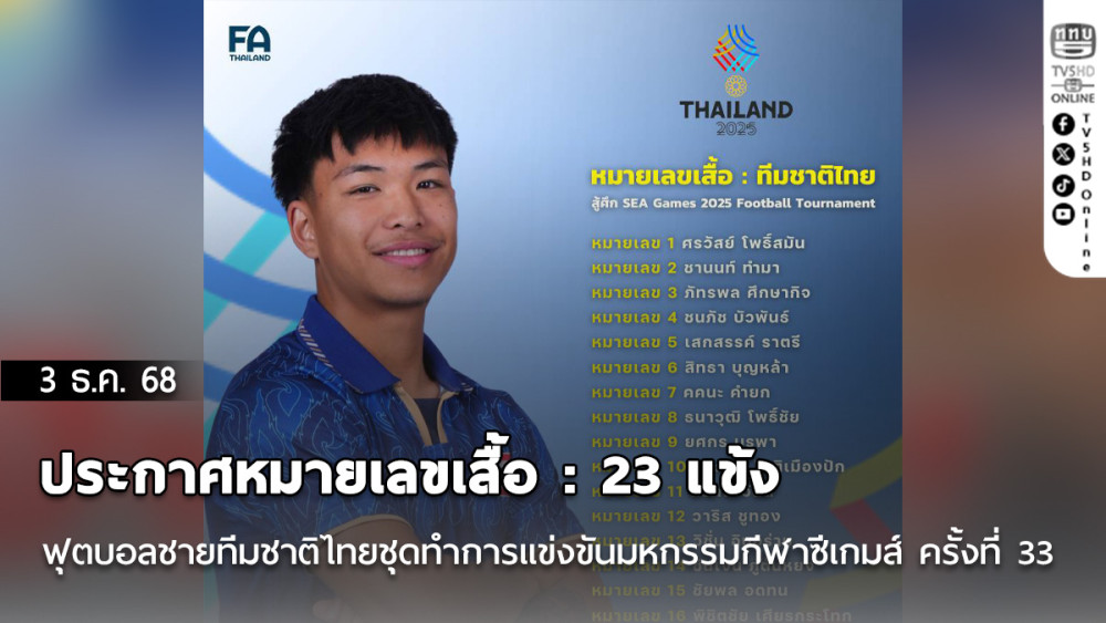 ฟุตบอลชายทีมชาติไทยชุดซีเกมส์ ประกาศหมายเลขเสื้อนักกีฬาทั้ง 23 คน ที่จะทําการแข่งขันฟุตบอลชายในมหกรรมกีฬาซีเกมส์ ครั้งที่ 33 ที่ประเทศไทยเป็นเจ้าภาพ (Men's SEA Games 2025 Football Tournament) ภายใต้การคุมทีมของ ธวัชชัย ดํารงอ่องตระกูล หัวหน้าผู้ฝึกสอน