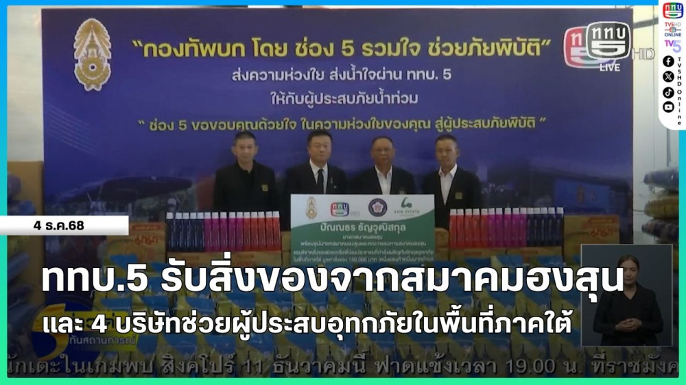 ททบ.5 รับสิ่งของจากสมาคมฮงสุนและ 4 บริษัทช่วยผู้ประสบอุทกภัยในพื้นที่ภาคใต้