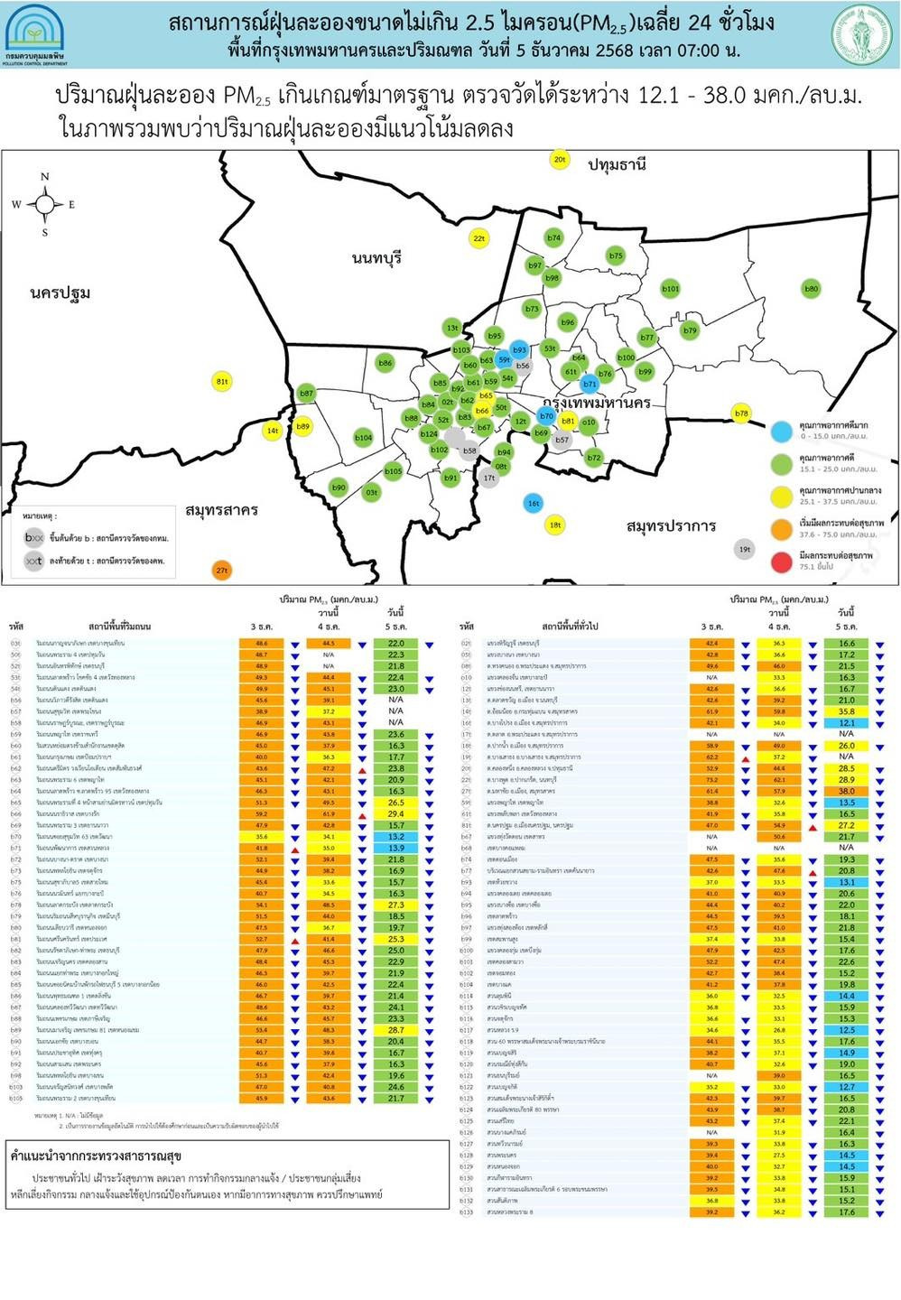 พื้นที่กรุงเทพมหานครและปริมณฑล ตรวจพบค่าฝุ่นเกินมาตรฐาน 1 เขต โดยภาพรวมวัดได้ 12.1 – 38.0 มคก./ลบ.ม. แม้อยู่ในระดับปานกลาง แต่ยังต้องติดตามอย่างต่อเนื่อง