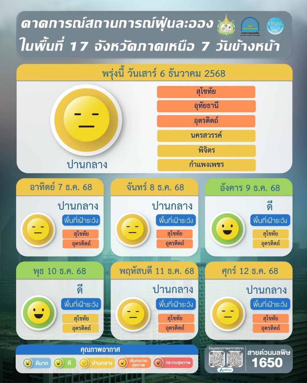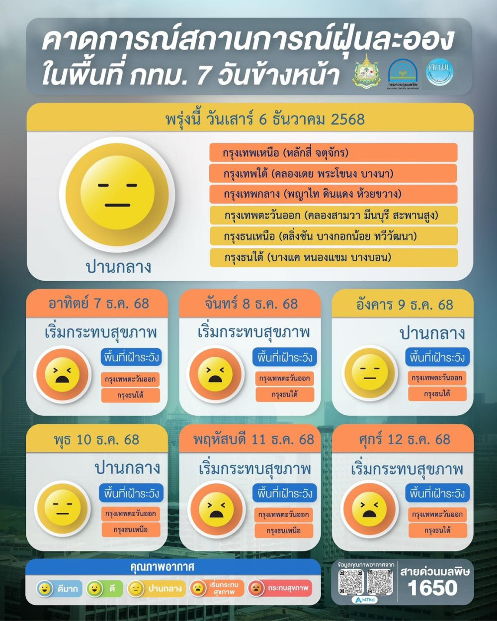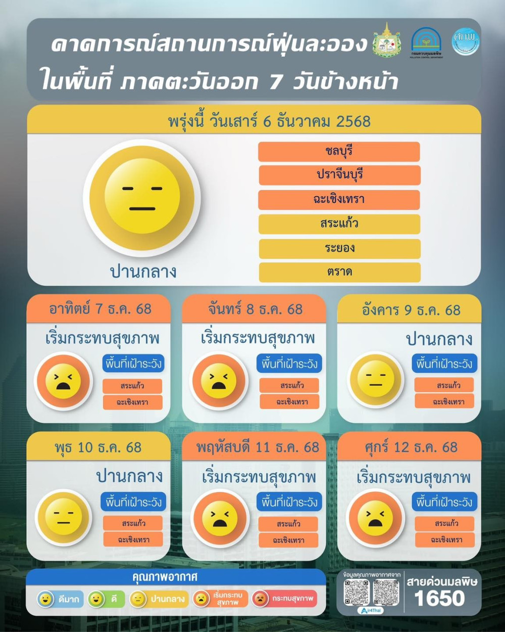 คาดการณ์ 7 วันข้างหน้า (6 – 12 ธ.ค. 2568) กทม.–ปริมณฑล แนวโน้ม เพิ่มขึ้น ตลอดช่วง 6–12 ธ.ค. ต้องเฝ้าระวังพื้นที่เสี่ยง , ภาคเหนือ (17 จว.) แนวโน้ม ลดลง ช่วง 9–10 ธ.ค. แต่ยังมีบางพื้นที่ต้องติดตาม , ภาคอีสาน แนวโน้ม เพิ่มขึ้น หลายพื้นที่ ส่วนภาคตะวันออก แนวโน้ม เพิ่มขึ้น เช่นกัน