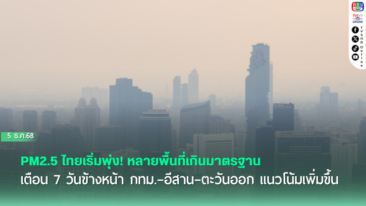 ค่าฝุ่น PM2.5 ทั่วไทยส่วนใหญ่อยู่ในเกณฑ์ปกติ แต่ยังพบเกินค่ามาตรฐานในหลายจังหวัด ศูนย์สื่อสารฯ เตือน 7 วันข้างหน้า กทม.–อีสาน–ตะวันออก แนวโน้มเพิ่มขึ้น ต้องเฝ้าระวังใกล้ชิด