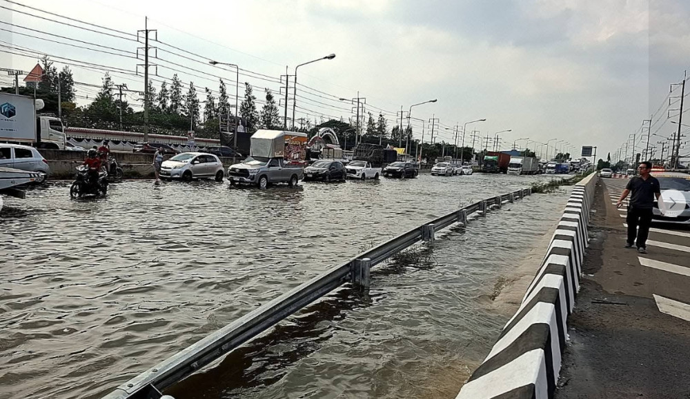 ท่วมแล้ว! พระราม2ขาเข้ากทม. บริเวณสะพานคลองหลวงรถติด ควรเลี่ยงเส้นทาง