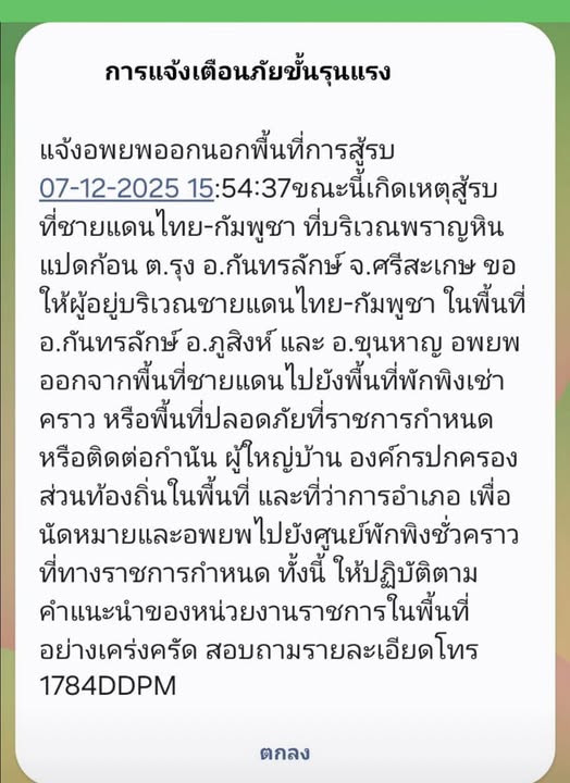 วันที่ 7 ธ.ค.68 - เวลา 15.54 น. กรมป้องกันและบรรเทาสาธารณภัย (ปภ.) ได้ออกข้อความ Cell Broadcast แจ้งเตือนภัยขั้นรุนแรงให้ประชาชนที่อยู่บริเวณชายแดน ไทย–กัมพูชา เร่งอพยพออกจากพื้นที่หลังเกิดเหตุสู้รบในเขต พรานหิน–แปดก้อน ต.รุง อ.กันทรลักษ์ จ.ศรีสะเกษ