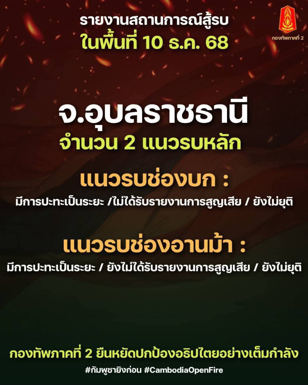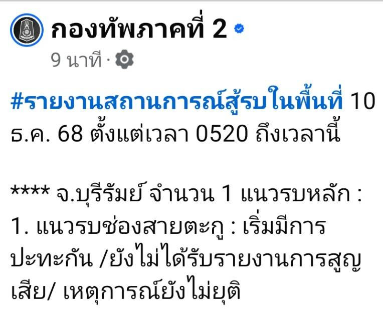 กองทัพภาคที่ 2 รายงานสถานการณ์สู้รบตั้งแต่เช้ามืด 10 ธ.ค. 68 ครอบคลุม 12 แนวรบใน 4 จังหวัดชายแดนภาคอีสาน หลายพื้นที่มีการยิงปะทะเป็นระยะ ขณะนี้ยังไม่ปรากฏรายงานการสูญเสียและเหตุการณ์ยังไม่ยุติ