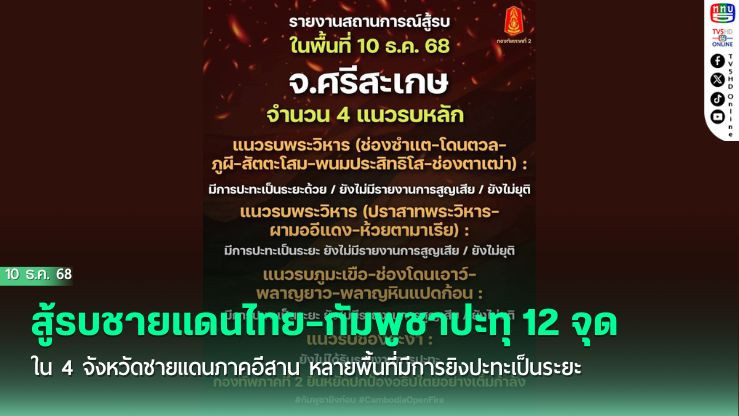 เพจ Facebook ของกองทัพภาคที่ 2 รายงานสถานการณ์การสู้รบตามแนวชายแดนไทย–กัมพูชา ตั้งแต่เวลา 05.20 น. ของวันที่ 10 ธันวาคม 2568 จนถึงขณะนี้ พบความเคลื่อนไหวสําคัญในพื้นที่ 4 จังหวัด รวม 12 แนวรบหลัก ดังนี้