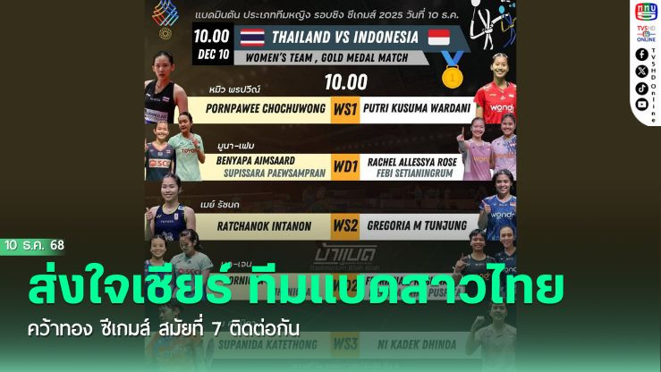 วันนี้(10 ธ.ค.) เวลา 10.00 น. แบดมินตันซีเกมส์ ประเภททีมหญิงนัดชิงชนะเลิศ จะเป็นการพบกัน ระหว่าง ทีมชาติไทย พบกับ ทีมชาติอินโดนีเซีย ถ่ายทอดสดทางช่อง NBT