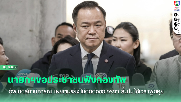 นายกฯขอประชาชน ฟังกองทัพอัปเดตสถานการณ์ชายแดนไทย-กัมพูชา ชี้เป็นข้อมูลที่ถูกต้อง เผยเขมรยังไม่ติดต่อขอเจรจา ลั่นไม่ใช่เวลาพูดคุย บอกยังไม่ขอเปิดประชุมร่วมรัฐสภา เหตุกองทัพยังคุมสถานการณ์ได้