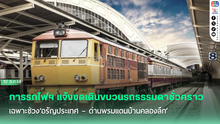 10 ธ.ค.2568-รายงานข่าวจากการรถไฟแห่งประเทศไทย (รฟท.) แจ้งงดเดินขบวนรถธรรมดาหมายเลข 275/276 และ 279/280 เฉพาะช่วงอรัญประเทศ – ด่านพรมแดนบ้านคลองลึกเป็นการชั่วคราว ตั้งแต่วันนี้เป็นต้นไป จนกว่าจะมีประกาศเปลี่ยนแปลง หลังจังหวัดสระแก้วแจ้งเตือนให้ประชาชนในพื้นที่ชายแดนไทย–กัมพูชา ได้แก่ อําเภอตาพระยา อําเภอโคกสูง อําเภออรัญประเทศ และอําเภอคลองหาด อพยพไปยังศูนย์พักพิงชั่วคราว หรือพื้นที่ปลอดภัย เนื่องจากเกิดเหตุการณ์ความไม่สงบในบริเวณชายแดน
