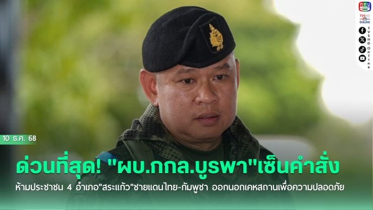 ด่วนที่สุด!!! "ผบ.กกล.บูรพา"เซ็นคําสั่ง ห้ามประชาชน 4 อําเภอ"สระแก้ว"ชายแดนไทย-กัมพูชา ออกนอกเคหสถานเพื่อความปลอดภัย