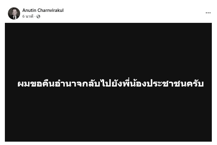 ล่าสุด นายอนุทิน ได้โพสต์เฟซบุ๊ก ระบะว่า "ผมขอคืนอํานาจกลับไปยังพี่น้องประชาชนครับ"