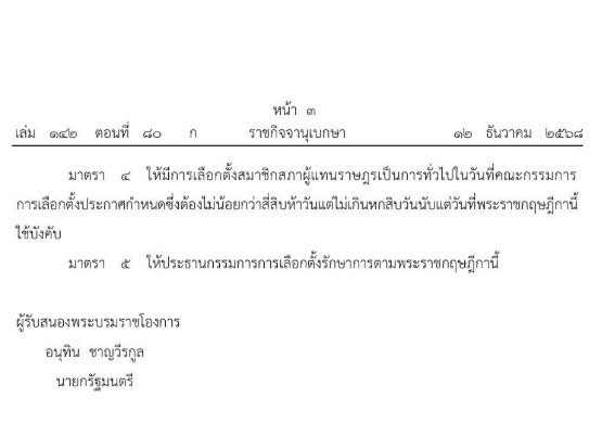 มาตรา ๔ ให้มีการเลือกตั้งสมาชิกสภาผู้แทนราษฎรเป็นการทั่วไปในวันที่คณะกรรมการการเลือกตั้งประกาศกําหนดซึ่งต้องไม่น้อยกว่าสี่สิบห้าวันแต่ไม่เกินหกสิบวันนับแต่วันที่พระราชกฤษฎีกานี้ใช้บังคับ