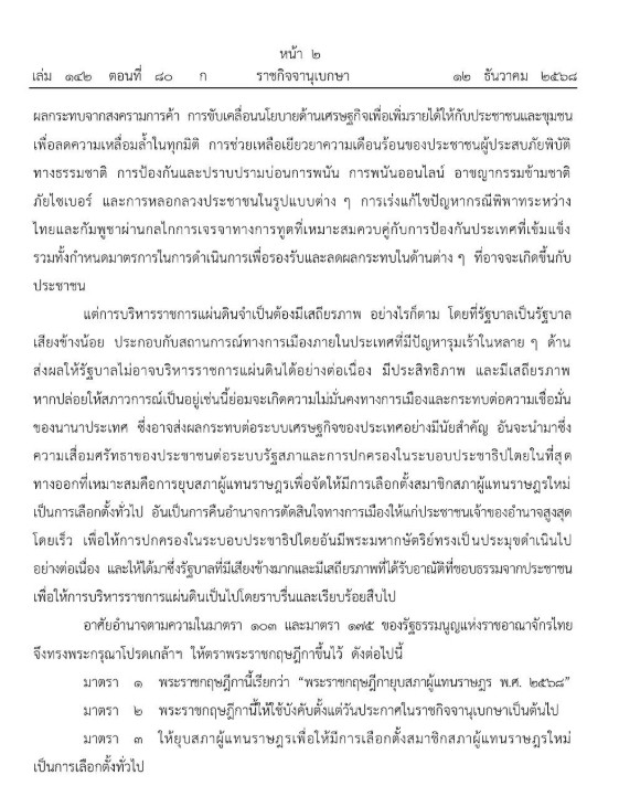 วันที่ 12 ธ.ค.2568 เว็บไซต์ ราชกิจจานุเบกษา เผยแพร่พระราชกฤษฎีกายุบสภา พ.ศ.2568 ระบุว่าพระบาทสมเด็จพระปรเมนทรรามาธิบดีศรีสินทรมหาวชิราลงกรณ พระวชิรเกล้าเจ้าอยู่หัว มีพระบรมราชโองการโปรดเกล้าฯ ให้ประกาศว่าด้วยนายกรัฐมนตรีได้นําความกราบบังคมทูลฯ สมควรยุบสภาผู้แทนราษฎร เพื่อจัดให้มีการเลือกตั้งสมาชิกสภาผู้แทนราษฎรใหม่เป็นการเลือกตั้งทั่วไป