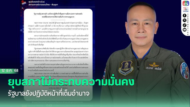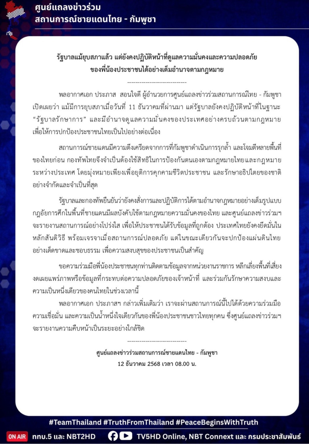 พลอากาศเอก ประภาส สอนใจดี ผู้อํานวยการศูนย์แถลงข่าวร่วมสถานการณ์ไทย–กัมพูชา เปิดเผยว่า แม้ประเทศไทยมีการยุบสภาเมื่อวันที่ 11 ธันวาคมที่ผ่านมา แต่รัฐบาลยังคงทําหน้าที่ในฐานะ “รัฐบาลรักษาการ” ซึ่งมีอํานาจตามกฎหมายครบถ้วนในการดูแลความมั่นคงและความปลอดภัยของประชาชน เพื่อให้การปกป้องประเทศเป็นไปอย่างไร้รอยต่อ