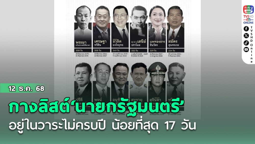 กางลิสต์‘นายกรัฐมนตรี’อยู่ในวาระไม่ครบปี น้อยที่สุด 17 วัน