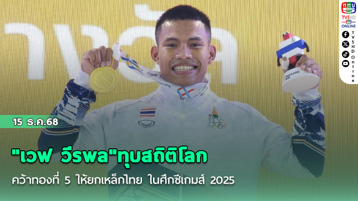 ยกน้ําหนัก รุ่น 71 กิโลกรัม ชาย มีนักกีฬาแข่งขัน 5 คน ทีมไทยส่ง “เวฟ” จ่าอากาศตรี วีรพล วิชุมา เจ้าของเหรียญเงินโอลิมปิกเกมส์ “ปารีส 2024” ขึ้นเวที ท่าสแนทช์ วีรพล เรียกเหล็กมากที่สุด ออกมายกเป็นคนสุดท้าย โชว์ฟอร์มสมราคา ยกผ่านไปแบบสบายๆ ทั้ง 3 ครั้ง 142, 147 และ 152 กิโลกรัม ตามลําดับ/ ท่าคลีนแอนด์เจิร์ก วีรพล ยังโชว์ฟอร์มสุดเหนือชั้น ครั้งแรกยกผ่านที่ 185 กิโลกรัม, ครั้งที่ 2 เพิ่มน้ําหนักรวดเดียว 10 กิโลกรัม ยกผ่านที่ 195 กิโลกรัม พร้อมทําลายสถิติโลกท่าคลีนแอนด์เจิร์กของตัวเองที่เคยทําไว้ 194 กิโลกรัม เมื่อเดือนตุลาคม 2568 ในการแข่งขันยกน้ําหนักชิงชนะเลิศแห่งโลก โดย วีรพล ไม่ได้ออกมายกครั้งที่ 3 ทําให้สถิติรวมอยู่ที่ 347 กิโลกรัม คว้าเหรียญทองที่ 5 ให้ทีมยกน้ําหนักไทย พร้อมทําลายสถิติโลกน้ําหนักรวมของตัวเองที่เคยทําไว้ 346 กิโลกรัม เมื่อเดือนตุลาคม 2568 ในการแข่งขันยกน้ําหนักชิงชนะเลิศแห่งโลกด้วย