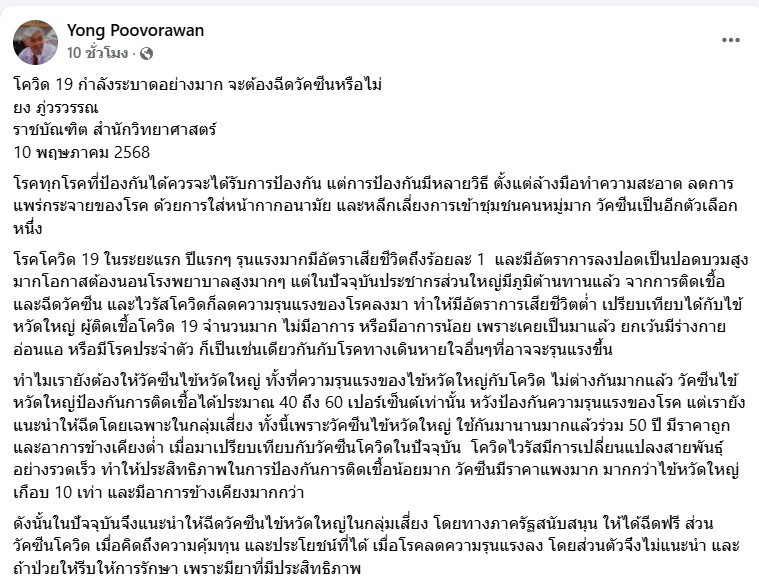 วันที่ 10 พฤษภาคม 2568 ศ.นพ.ยง ภู่วรวรรณ ราชบัณฑิต สำนักวิทยาศาสตร์ โพสต์ข้อความผ่านเฟซบุ๊กส่วนตัว กล่าวถึงสถานการณ์การระบาดของโรคโควิด‑19 ว่า แม้โควิดยังระบาดอยู่ แต่ประชากรส่วนใหญ่มีภูมิต้านทานทั้งจากการติดเชื้อและการฉีดวัคซีน ขณะที่เชื้อไวรัสเองก็ลดความรุนแรงลง จนอัตราการเสียชีวิตและภาวะปอดอักเสบใกล้เคียงกับไข้หวัดใหญ่