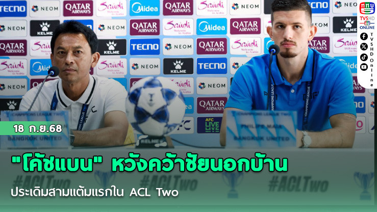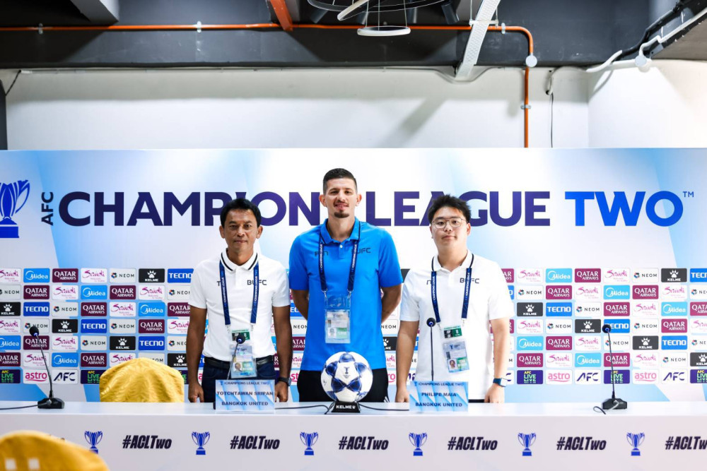 ณ ห้องแถลงข่าวสนามสนามเปตาลิง จาญ่า สเตเดียม “โค้ชแบน” ธชตวัน ศรีปาน และ ฟิลิป ไมอา ในฐานะตัวแทนของสโมสรทรู แบงค็อก ยูไนเต็ด เข้าร่วมแถลงข่าวก่อนเกมการแข่งขัน ฟุตบอลเอเอฟซี แชมเปียนส์ ลีก ทู 2025/26 รอบแบ่งกลุ่ม นัดแรก ที่จะบุกไปเยือน เซลังงอร์ เอฟซี ตัวแทนจากมาเลเซีย ในวันนี้
