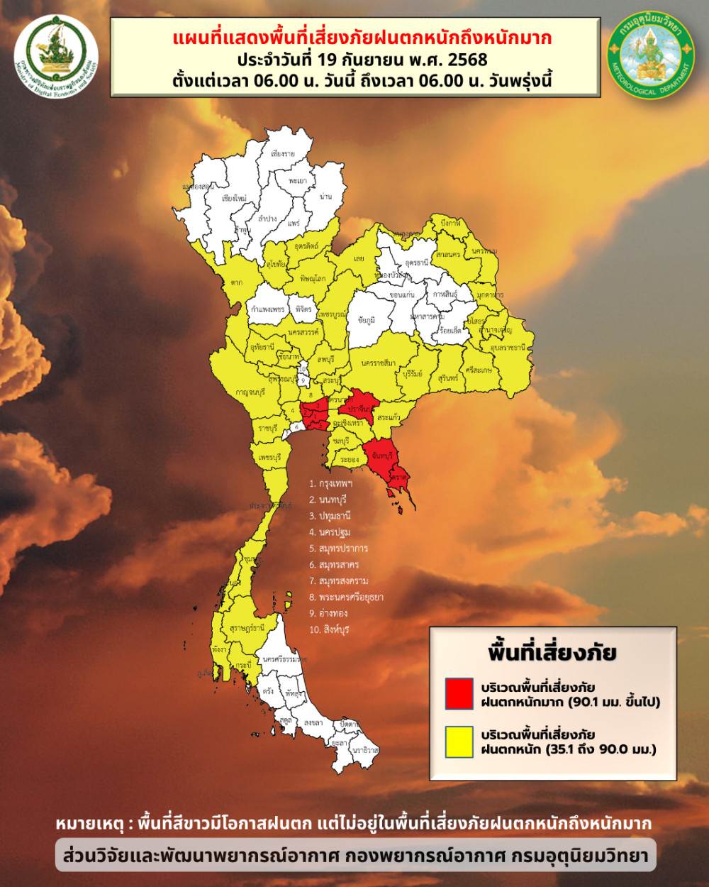 วันนี้19 กันยายน 2568 กรมอุตุนิยมวิทยาพยากรณ์อากาศ 24 ชั่วโมงข้างหน้า ประเทศไทยมีฝนตกหนักบางแห่ง และมีฝนตกหนักมากในกรุงเทพมหานครและปริมณฑลรวมทั้งภาคตะวันออก โดยเฉพาะบริเวณจังหวัดบุรีรัมย์ สุรินทร์ ศรีสะเกษ กรุงเทพมหานครและปริมณฑล ปราจีนบุรี จันทบุรี และตราด ขอให้ประชาชนบริเวณดังกล่าวระวังอันตรายจากฝนตกหนักถึงหนักมากและฝนที่ตกสะสม ซึ่งอาจทําให้เกิดน้ําท่วมฉับพลันและน้ําป่าไหลหลาก โดยเฉพาะพื้นที่ลาดเชิงเขาใกล้ทางน้ําไหลผ่านและพื้นที่ลุ่ม เนื่องจากร่องมรสุมพาดผ่านภาคกลาง ภาคตะวันออก และภาคตะวันออกเฉียงเหนือตอนล่าง เข้าสู่หย่อมความกดอากาศต่ํากําลังแรงบริเวณทะเลจีนใต้ ประกอบกับมรสุมตะวันตกเฉียงใต้ที่พัดปกคลุมทะเลอันดามัน ประเทศไทย และอ่าวไทยมีกําลังแรงขึ้น
