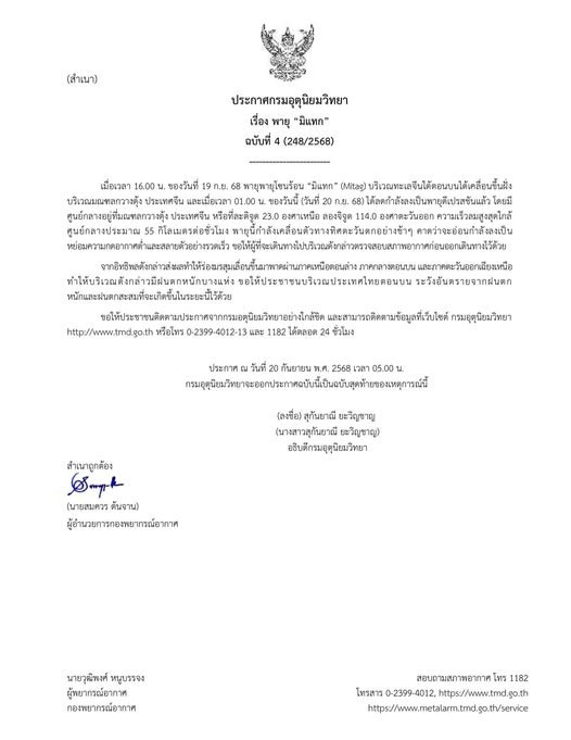 อนึ่ง พายุโซนร้อน "มิแทก" บริเวณทะเลมณฑลกวางตุ้ง ประเทศจีน ได้อ่อนกําลังลงเป็นพายุดีเปรสชันแล้ว คาดว่าจะอ่อนกําลังลงเป็นหย่อมความกดอากาศต่ําและสลายตัวอย่างรวดเร็ว ขอให้ผู้ที่จะเดินทางไปบริเวณดังกล่าวตรวจสอบสภาพอากาศก่อนออกเดินทางไว้ด้วย