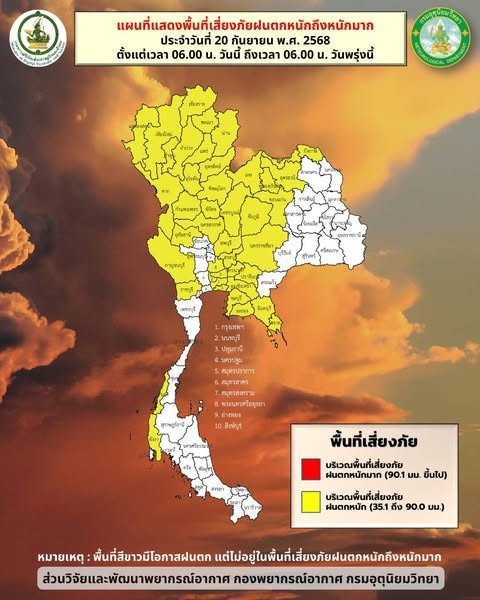 วันที่ 20 กันยายน 2568 - กรมอุตุนิยมวิทยา พยากรณ์อากาศ 24 ชั่วโมงข้างหน้า ประเทศไทยมีฝนตกหนักบางแห่งโดยเฉพาะบริเวณจังหวัดตาก พิษณุโลก เพชรบูรณ์ เลย ชัยภูมิ นครนายก ปราจีนบุรี จันทบุรี และตราด ขอให้ประชาชนบริเวณดังกล่าวระวังอันตรายจากฝนตกและฝนที่ตกสะสม ซึ่งอาจทําให้เกิดน้ําท่วมฉับพลันและน้ําป่าไหลหลาก โดยเฉพาะพื้นที่ลาดเชิงเขาใกล้ทางน้ําไหลผ่านและพื้นที่ลุ่ม เนื่องจากร่องมรสุมพาดผ่านภาคกลางและภาคตะวันออกเฉียงเหนือ ประกอบกับมรสุมตะวันตกเฉียงใต้ที่พัดปกคลุมทะเลอันดามัน ประเทศไทย และอ่าวไทยมีกําลังปานกลาง