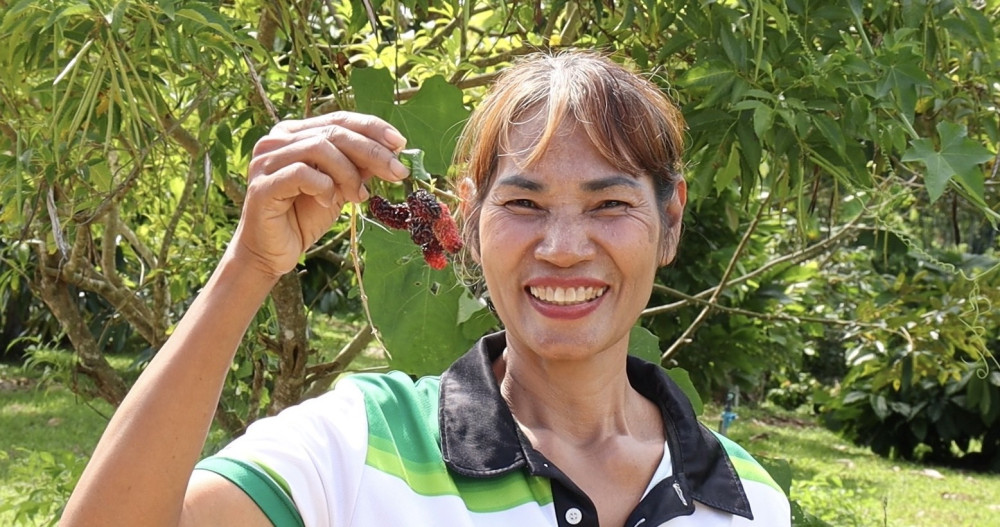 นางชดช้อย แสงทอง สมาชิกวิสาหกิจชุมชนฯ เล่าว่า “เป็นแม่เลี้ยงเดี่ยว ทํางานรับจ้างรายวัน หาเงินเลี้ยงลูก 3 คน ได้บ้างไม่ได้บ้าง สิ้นหวังไม่มีงานไม่มีกิน คิดว่าชาตินี้ไม่น่าจะมีบ้านและที่ทํากินแล้ว เมื่อได้โอกาสร่วมโครงการฯ ตอนแรกกลัวโดนหลอกมากแต่เมื่อเข้าร่วมแล้วปรากฏว่าทุกอย่างคือความจริง ทําให้ชีวิตมีความหวังเห็นแสงสว่างดีใจมาก วันนี้มีความสุขมากๆ ตอนนี้ทําสอนปลูกผัก ผลไม้เกือบทุกชนิด เลี้ยงปลาในกระชัง ทําเกษตร แม้จะยากและเหนื่อย แต่คิดว่าถ้าสู้เราทําได้ อยากให้ทุกคนมีความหวัง ”ธนาคารที่ดิน“ ช่วยเราได้จริงๆ