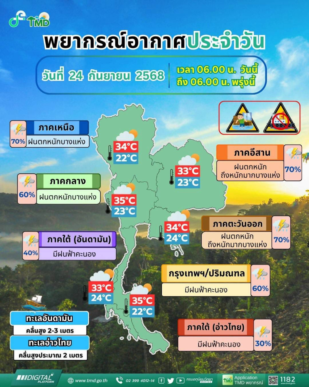 จากอิทธิพลของพายุ “รากาซา” ส่งผลให้ร่องมรสุมที่พาดผ่านภาคเหนือและภาคตะวันออกเฉียงเหนือตอนบน รวมถึงมรสุมตะวันตกเฉียงใต้ที่พัดปกคลุมทะเลอันดามัน ประเทศไทย และอ่าวไทยมีกําลังแรงขึ้นในช่วงวันที่ 24–26 ก.ย. 68 ทําให้บริเวณภาคเหนือ ภาคตะวันออกเฉียงเหนือ ภาคกลาง ภาคตะวันออก รวมทั้งกรุงเทพมหานครและปริมณฑลมีฝนเพิ่มมากขึ้นและมีฝนตกหนักถึงหนักมากหลายพื้นที่ ขอให้ประชาชนในบริเวณดังกล่าวระวังอันตรายจากฝนตกหนักถึงหนักมากและฝนที่ตกสะสม ซึ่งอาจทําให้เกิดน้ําท่วมฉับพลัน น้ําป่าไหลหลาก และน้ําล้นตลิ่ง โดยเฉพาะพื้นที่ลาดเชิงเขาใกล้ทางน้ําไหลผ่าน พื้นที่ลุ่ม และพื้นที่น้ําท่วมขัง สําหรับคลื่นลมบริเวณทะเลอันดามันและอ่าวไทยตอนบนมีกําลังแรงขึ้น โดยทะเลอันดามันตอนบนมีคลื่นสูง 2-3 เมตร บริเวณที่มีฝนฟ้าคะนองคลื่นสูงมากกว่า 3 เมตร ขอให้ชาวเรือเดินเรือด้วยความระมัดระวัง และเรือเล็กบริเวณทะเลอันดามันตอนบนควรงดออกจากฝั่งในช่วงวันที่ 24–26 ก.ย. 68