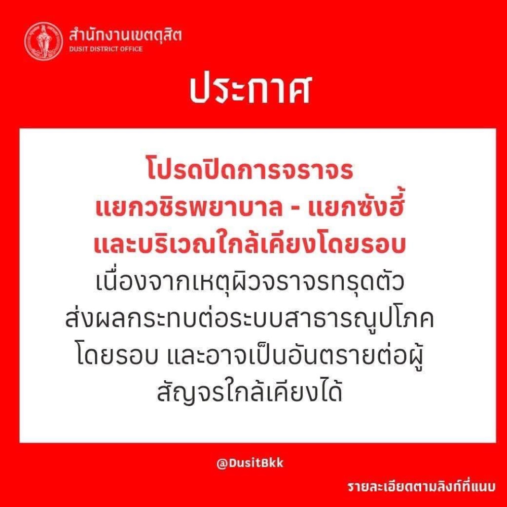 สํานักงานเขตดุสิต รายงานว่า เวลา 07.40 น. ปิดการจราจรแยกวชิรพยาบาล-แยกซังฮี้ และบริเวณใกล้เคียงโดยรอบ เนื่องจากเหตุผิวจราจรทรุดตัว ส่งผลกระทบต่อระบบสาธารณูปโภคโดยรอบ และอาจเป็นอันตรายต่อผู้สัญจรใกล้เคียงได้
