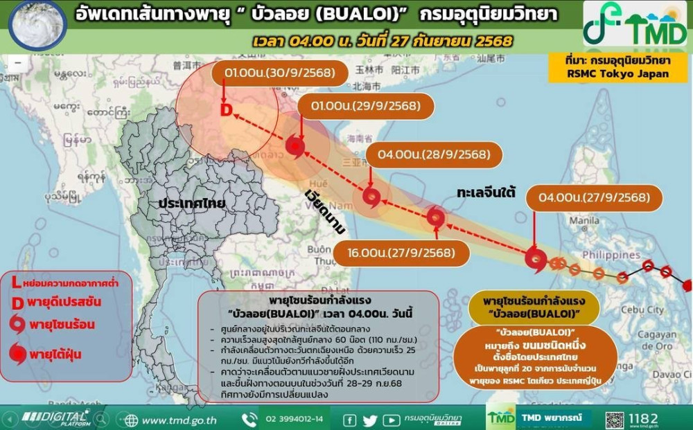 ขณะเดียวกัน พายุโซนร้อนกําลังแรง “บัวลอย” ได้เคลื่อนลงสู่ทะเลจีนใต้ตอนกลางแล้ว และมีแนวโน้มจะเคลื่อนขึ้นฝั่งประเทศเวียดนามตอนบนในช่วงวันที่ 28–29 กันยายน 2568 ซึ่งอาจส่งผลกระทบต่อสภาพอากาศของไทยให้เกิดฝนตกเพิ่มมากขึ้นอีกระยะหนึ่ง