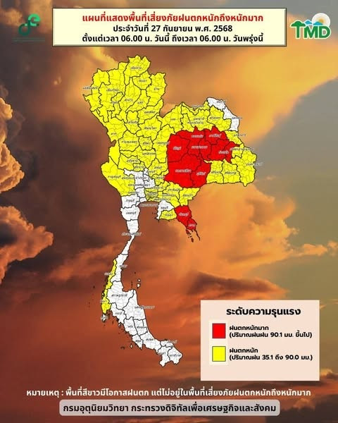 วันที่ 27 กันยายน 2568 - กรมอุตุนิยมวิทยาออกประกาศพยากรณ์อากาศ 24 ชั่วโมงข้างหน้า เตือนว่าประเทศไทยจะมีฝนเพิ่มขึ้น โดยมีฝนตกหนักถึงหนักมากในหลายพื้นที่ของภาคเหนือ ภาคตะวันออกเฉียงเหนือ และภาคตะวันออก โดยเฉพาะจังหวัดพิษณุโลก เพชรบูรณ์ เลย หนองบัวลําภู อุดรธานี ชัยภูมิ ขอนแก่น นครราชสีมา บุรีรัมย์ จันทบุรี และตราด ส่วนภาคกลางรวมถึงกรุงเทพมหานครและปริมณฑลก็มีฝนตกหนักบางแห่งเช่นกัน