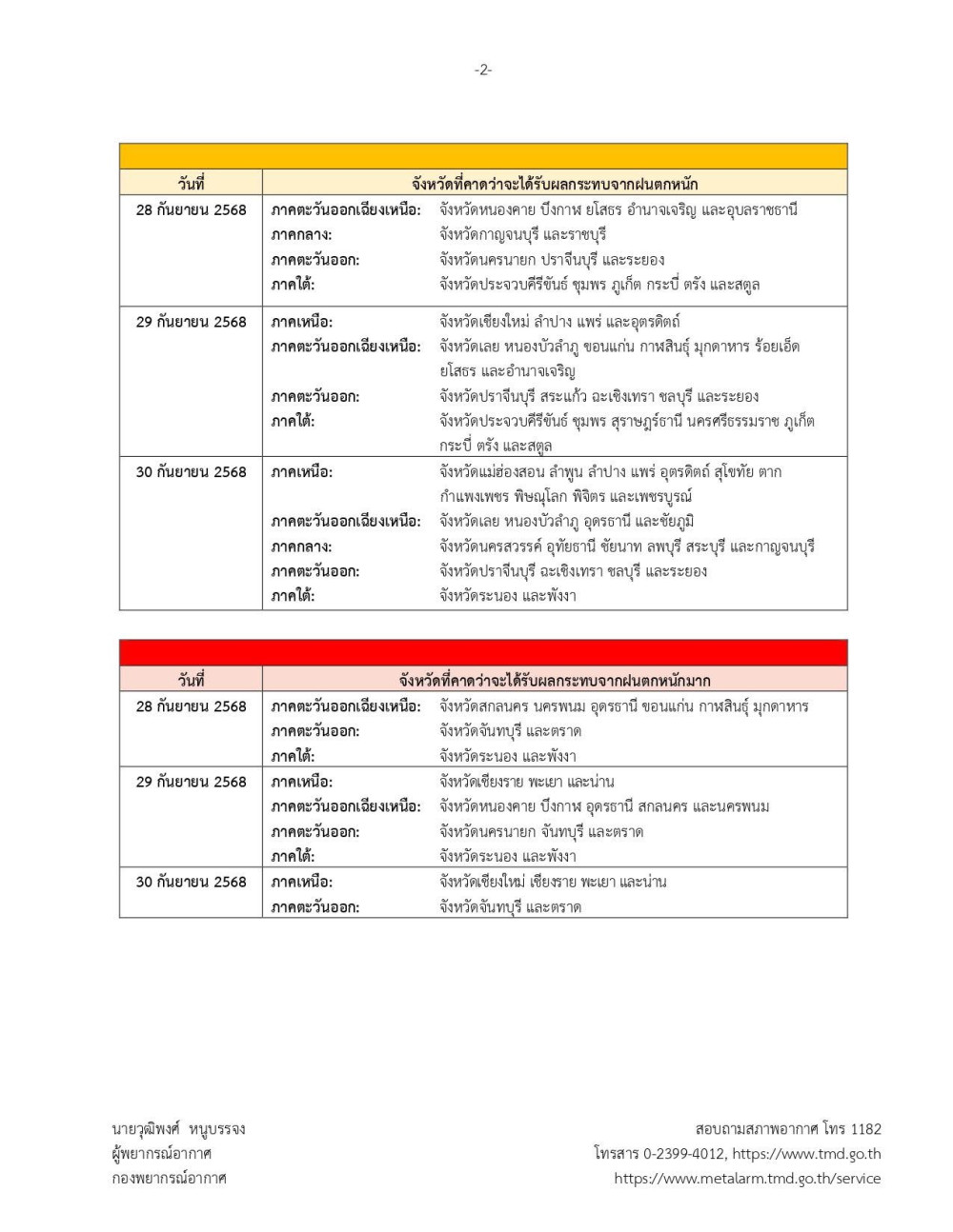 ขอให้ประชาชนในพื้นที่เสี่ยงระวังอันตรายจากฝนตกหนักถึงหนักมากและฝนที่ตกสะสม ซึ่งอาจทําให้เกิดน้ําท่วมฉับพลัน น้ําป่าไหลหลาก และน้ําล้นตลิ่ง โดยเฉพาะพื้นที่ลาดเชิงเขาและพื้นที่ลุ่มต่ํา