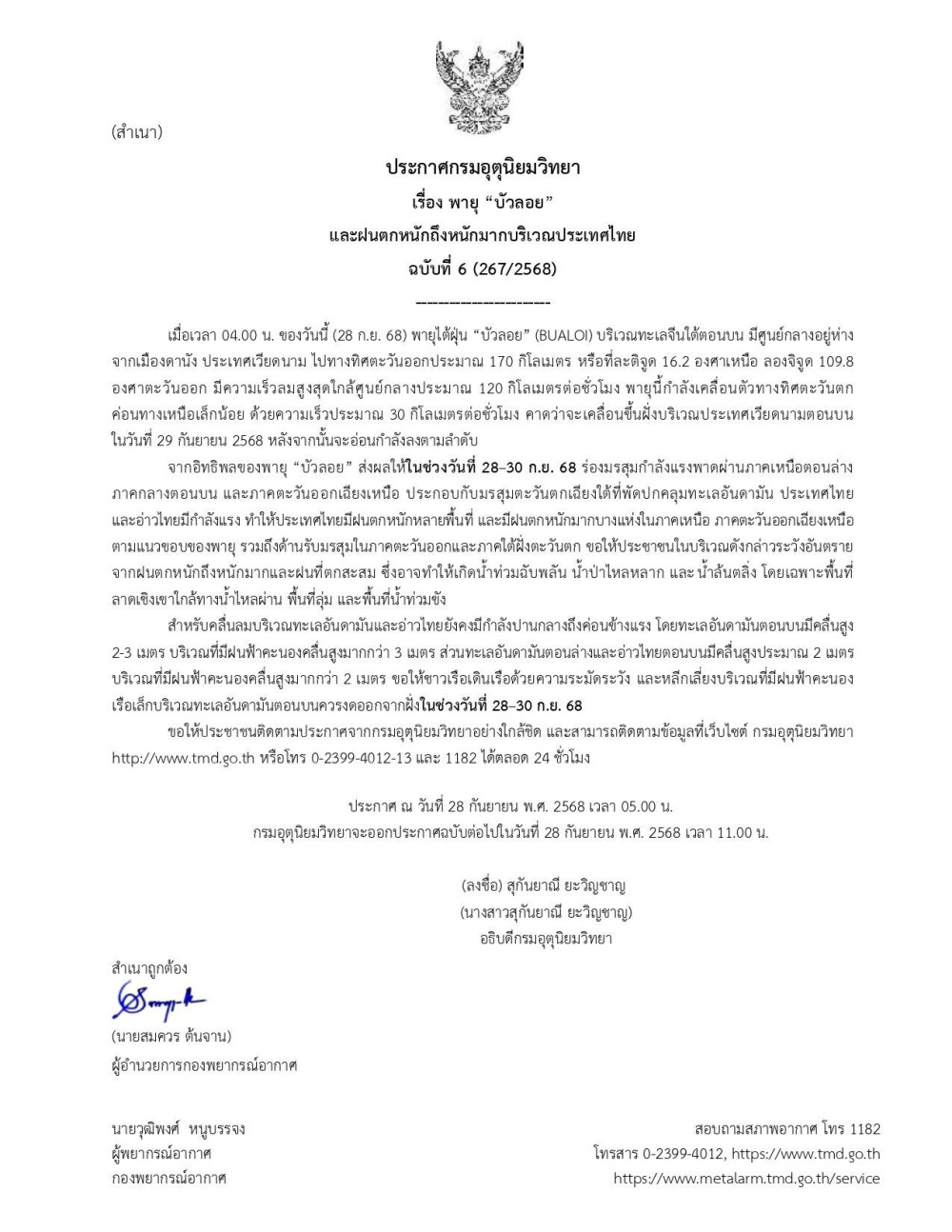 อนึ่ง พายุไต้ฝุ่น “บัวลอย” (BUALOI) ปกคลุมบริเวณทะเลจีนใต้ตอนบน คาดว่าจะเคลื่อนขึ้นฝั่งประเทศเวียดนามตอนบนในวันที่ 29 ก.ย. 68