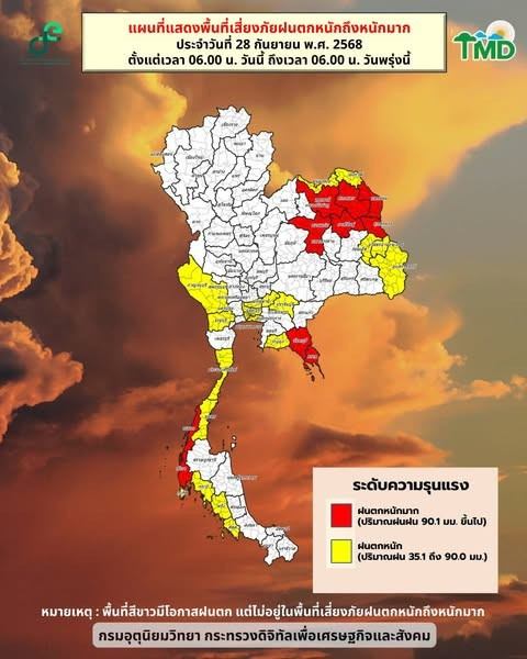 วันที่ 28 กันยายน 2568 - กรมอุตุนิยมวิทยา พยากรณ์อากาศ 24 ชั่วโมงข้างหน้า ประเทศไทยมีฝนตกหนักหลายพื้นที่ และมีฝนตกหนักถึงหนักมากบางแห่งบริเวณภาคตะวันออกเฉียงเหนือ และภาคตะวันออก โดยเฉพาะบริเวณจังหวัดสกลนคร นครพนม อุดรธานี ขอนแก่น กาฬสินธุ์ มุกดาหาร จันทบุรี และตราด ขอให้ประชาชนบริเวณประเทศไทยตอนบนระวังอันตรายจากฝนตกหนักถึงหนักมากและฝนที่ตกสะสม ซึ่งอาจทําให้เกิดน้ําท่วมฉับพลัน น้ําป่าไหลหลาก และน้ําล้นตลิ่ง โดยเฉพาะพื้นที่ลาดเชิงเขาใกล้ทางน้ําไหลผ่าน พื้นที่ลุ่ม และพื้นที่น้ําท่วมขัง เนื่องจากร่องมรสุมกําลังแรงพาดผ่านภาคเหนือตอนล่าง ภาคกลางตอนบน และภาคตะวันออกเฉียงเหนือตอนล่าง ประกอบกับมรสุมตะวันตกเฉียงใต้กําลังแรงพัดปกคลุมทะเลอันดามัน ภาคใต้ และอ่าวไทย