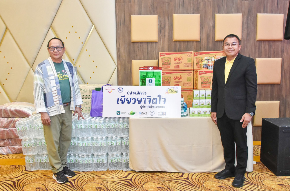 โดยมีพิธีส่งมอบสิ่งของบรรเทาทุกข์แก่ผู้แทนจังหวัด ได้แก่ นายพนัส จันทร์คํา หัวหน้าสํานักงานจังหวัดศรีสะเกษ และ นายพรชัยแสน ลีประโคน ป้องกันจังหวัดสุรินทร์ เพื่อกระจายความช่วยเหลือไปยังชุมชนอย่างทั่วถึง