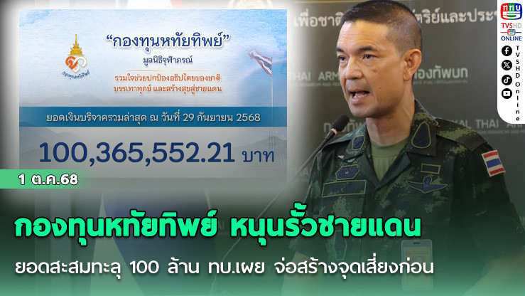 วันที่ 1 ตุลาคม 2568 - พล.ต.วินธัย สุวารี โฆษกกองทัพบก กล่าวถึงกรณียอดบริจาคสร้างรั้วและบังเกอร์ชายแดนไทย–กัมพูชา ของ “กองทุนหทัยทิพย์” ภายใต้มูลนิธิจุฬาภรณ์ ที่สมเด็จพระเจ้าน้องนางเธอ เจ้าฟ้าจุฬาภรณวลัยลักษณ์ อัครราชกุมารี กรมพระศรีสวางควัฒน วรขัตติยราชนารี ทรงพระราชทานทรัพย์ส่วนพระองค์บริจาคเป็นทุนตั้งต้นจํานวน 1 ล้านบาท โดยขณะนี้ยอดบริจาคสมทบได้ทะลุ 100 ล้านบาทแล้ว