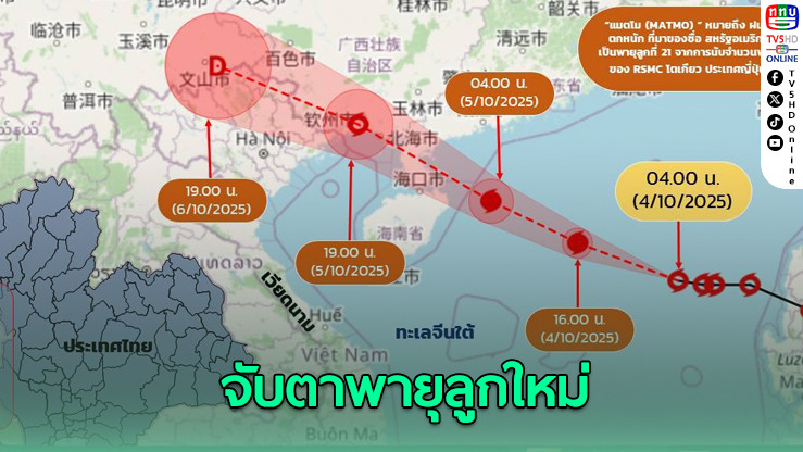 กรมอุตุฯ ออกประกาศเตือนฉบับที่ 4 พายุโซนร้อนกําลังแรง “แมตโม” มีแนวโน้มทวีกําลังเป็นไต้ฝุ่น เคลื่อนผ่านไหหลําลงสู่อ่าวตังเกี๋ยขึ้นฝั่งเวียดนาม 5–6 ต.ค. เหนือ–อีสานฝนเพิ่ม มีหนักบางแห่ง ด้านรับมรสุมภาคตะวันออก–ใต้ฝั่งตะวันตกเสี่ยงน้ําหลาก–น้ําท่วมฉับพลัน