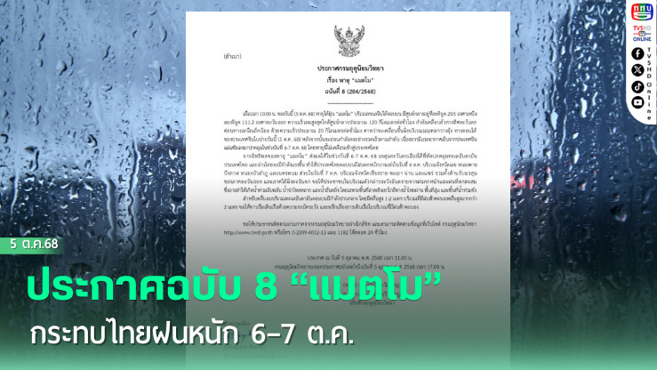 วันที่ 5 ตุลาคม 2568 - กรมอุตุนิยมวิทยา ออกประกาศฉบับที่ 8 เมื่อเวลา 10.00 น. วันที่ 5 ตุลาคม 2568 เตือนภัยพายุไต้ฝุ่น “แมตโม” ซึ่งขณะนี้กําลังเคลื่อนตัวอยู่บริเวณทะเลจีนใต้ตอนบน โดยมีศูนย์กลางอยู่ที่ละติจูด 20.5 องศาเหนือ ลองจิจูด 111.2 องศาตะวันออก มีความเร็วลมสูงสุดใกล้ศูนย์กลางประมาณ 120 กิโลเมตรต่อชั่วโมง เคลื่อนตัวทางทิศตะวันตกค่อนเหนือเล็กน้อยด้วยความเร็วประมาณ 20 กิโลเมตรต่อชั่วโมง คาดว่าจะเคลื่อนขึ้นฝั่งบริเวณมณฑลกวางตุ้ง ทางตอนใต้ของประเทศจีนในช่วงบ่ายวันนี้ (5 ต.ค.) ก่อนจะอ่อนกําลังลงอย่างรวดเร็วจากการปะทะมวลอากาศเย็นที่แผ่เสริมลงมาจากประเทศจีนในช่วงวันที่ 6–7 ตุลาคม
