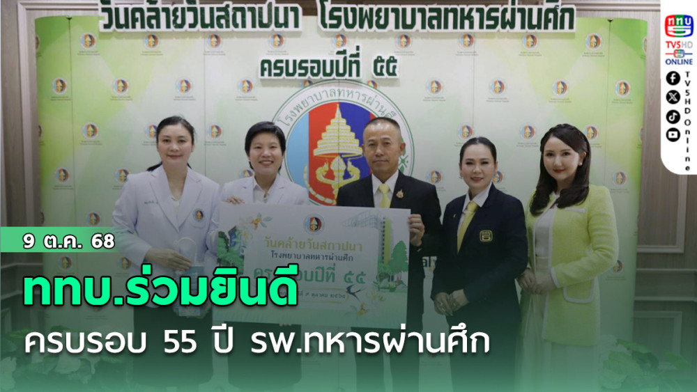 วันที่ 9 ตุลาคม 2568 - สถานีวิทยุโทรทัศน์กองทัพบก (ททบ.) โดยพลโท ยุทธกร สุภาสูรย์ รองผู้อํานวยการใหญ่สายงานบริหาร สถานีวิทยุโทรทัศน์กองทัพบก พร้อมด้วย นางจิราภรณ์ อินโต ผู้อํานวยการฝ่ายนโยบายและแผนได้เข้าร่วมแสดงความยินดีต่อ นางจิตติมา ปรีชา ผู้อํานวยการโรงพยาบาลทหารผ่านศึก เนื่องในโอกาสครบรอบ 55 ปี โรงพยาบาลทหารผ่านศึก พร้อมร่วมสมทบทุนเพื่อกิจกรรมสาธารณประโยชน์